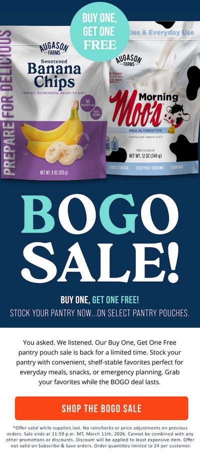 Buy One Get One Free on select Pantry Pouches. All items must be added to cart, discount will be applied at checkout.